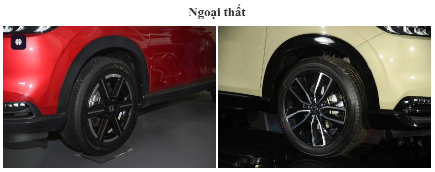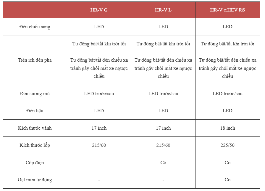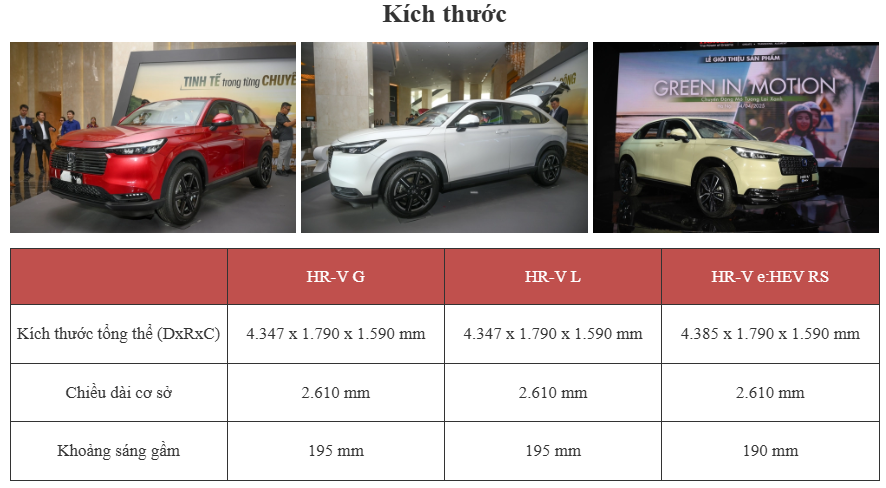 Kích thước tổng thể của phiên bản RS dài x rộng x cao lần lượt là 4. 385 x 1.790 x 1.590 (mm), trong khi phiên bản G và L chiều dài tổng thể ngắn hơn 38mm. Trục cơ sở 2.610mm, khoảng sáng gầm 190-195mm tùy phiên bản. Các trang bị nổi bật ở ngoại thất xe bao gồm lưới tản nhiệt mới, vuông vức hơn. Cụm đèn phía trước tinh chỉnh với cụm LED thấu kính bên trong, tương tự như đàn anh CR-V hybrid. Đây cũng là chi tiết khác biệt khi so với 2 phiên bản thấp hơn vẫn chủ yếu sử dụng LED choá phản xạ.