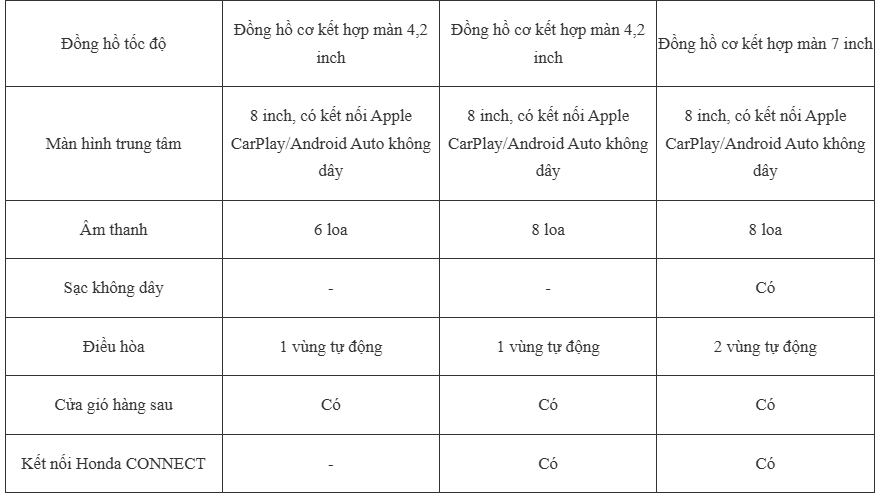 Vào bên trong, xe sử dụng vô-lăng 3 chấu bọc da kèm các phím bấm chức năng như hệ thống giải trí, gói công nghệ an toàn Honda Sensing, camera lane watch. Đồng hồ hiển thị gồm màn hình LCD 7 inch trên bản RS và 4,2 inch trên 2 phiên bản còn lại. Màn hình giải trí cảm ứng kích thước 8 inch hỗ trợ kết nối Apple Carplay hoặc Android Auto.