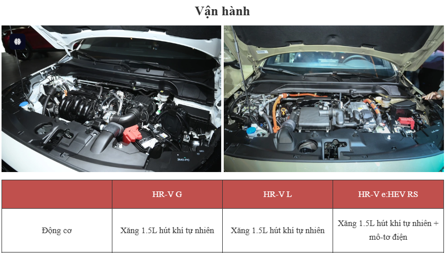 Honda HR-V 2025 là bản nâng cấp giữa vòng đời dòng xe này. Điểm nhấn của mẫu xe này là lần đầu tiên HR-V tại Việt Nam có tùy chọn động cơ hybrid trên phiên bản e:HEV RS. Theo đó, động cơ xe bao gồm máy xăng 1.5L mạnh 105 mã lực, 127Nm; đi kèm động cơ điện mạnh 129 mã lực, 253Nm. Hệ dẫn động cầu trước và hộp số tự động e-CVT. Mức tiêu thụ nhien liệu chỉ 4,44 lít/100km.