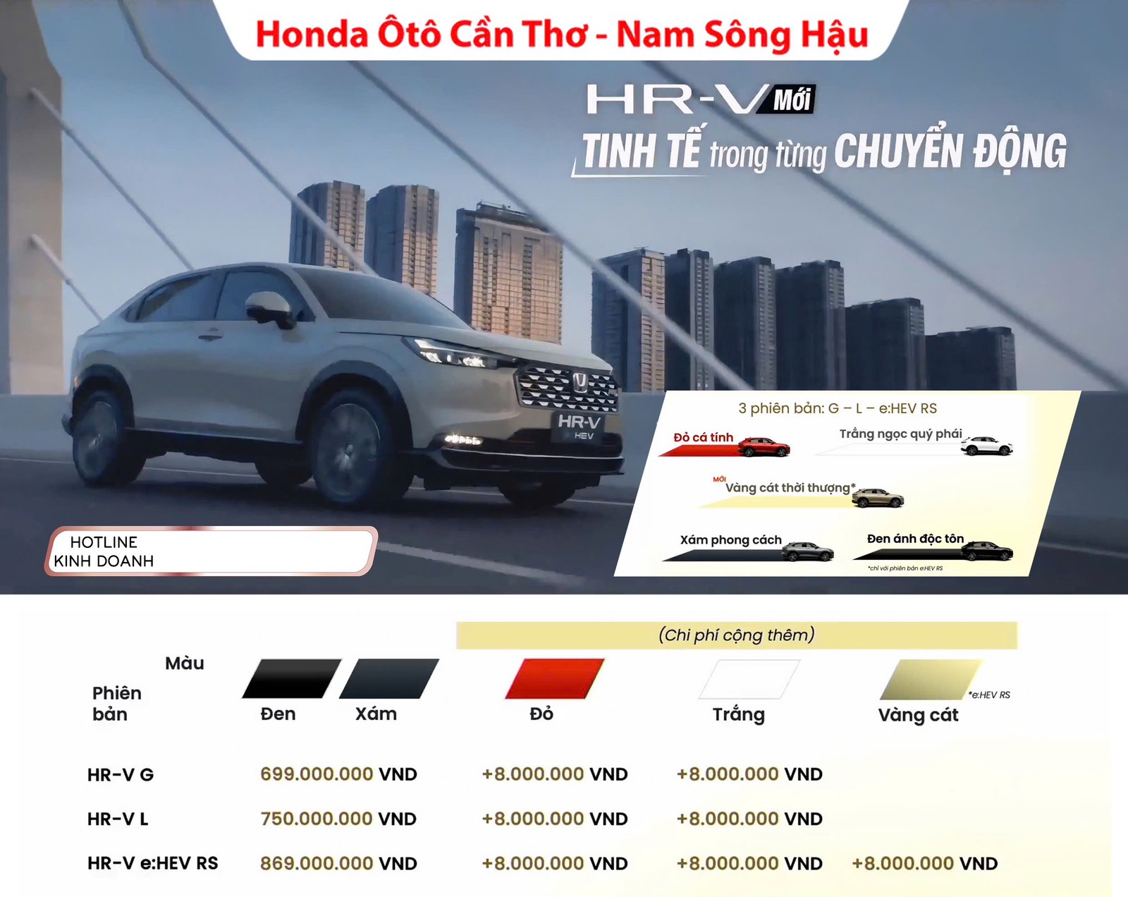 Honda HR-V 2025 chính thức ra mắt Việt Nam. Xe được phân phối 3 phiên bản bao gồm: HR-V G giá 699 triệu đồng, HR-V L giá 750 triệu đồng, HR-V e:HEV RS giá 869 triệu đồng. Các màu đỏ, trắng và vàng cát cộng thêm 8 triệu đồng.