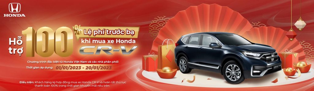 Công ty Honda Việt Nam phối hợp cùng các Nhà Phân phối ô tô triển khai chương trình khuyến mại: Hỗ trợ 100% lệ phí trước bạ cho khách hàng mua xe Honda CR-V từ ngày 01 đến hết ngày 20 tháng 01 năm 2023.